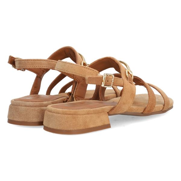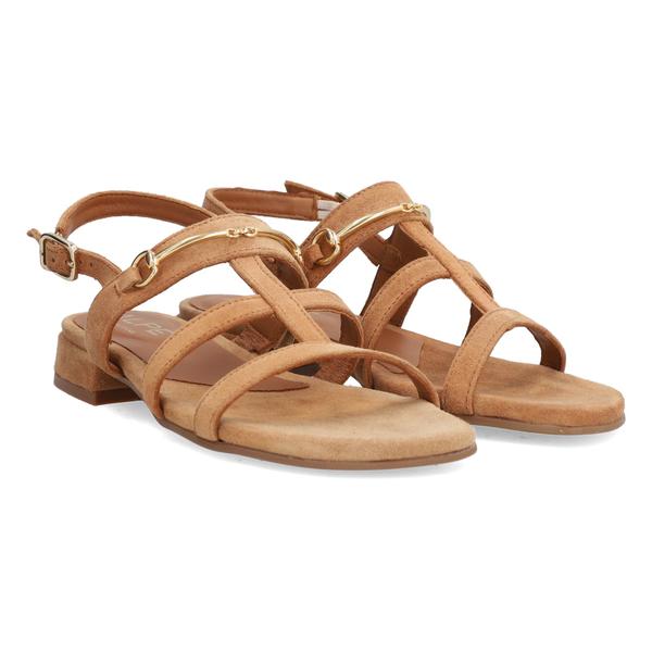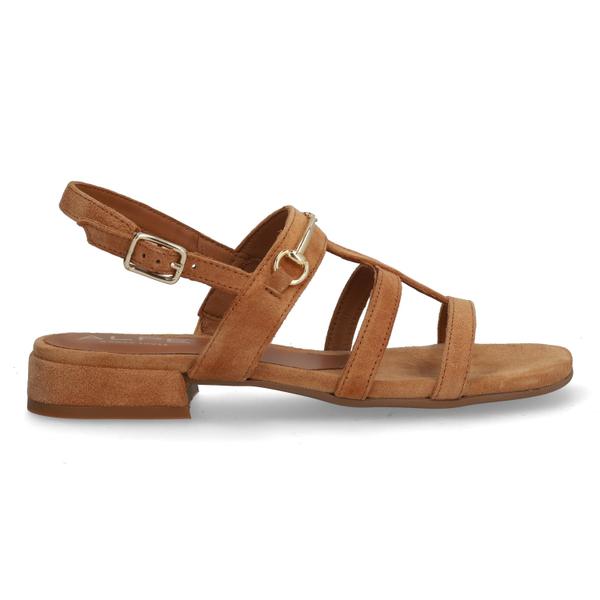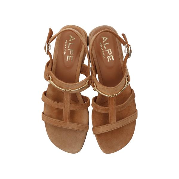 ALPE AMALFI fabricado en piel (baby silk) de color tan con tacón de 2 cm, suela antideslizante y puntera cuadrada, con cierre mediante hebilla .