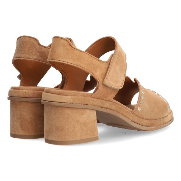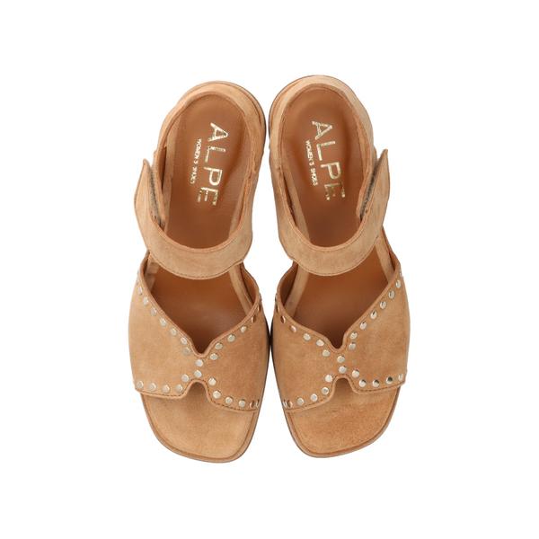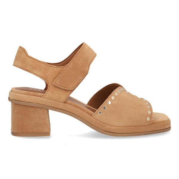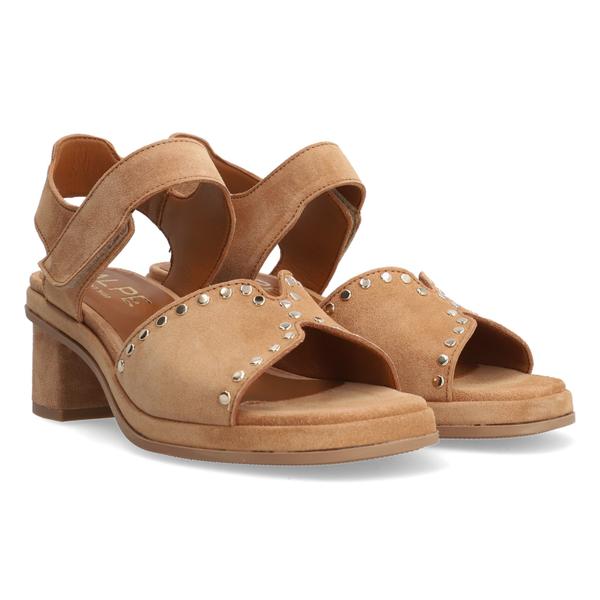 ALPE SENA fabricado en piel (baby silk) de color marrón con tacón de 5 cm, suela antideslizante y puntera cuadrada, con cierre mediante autoadherente .