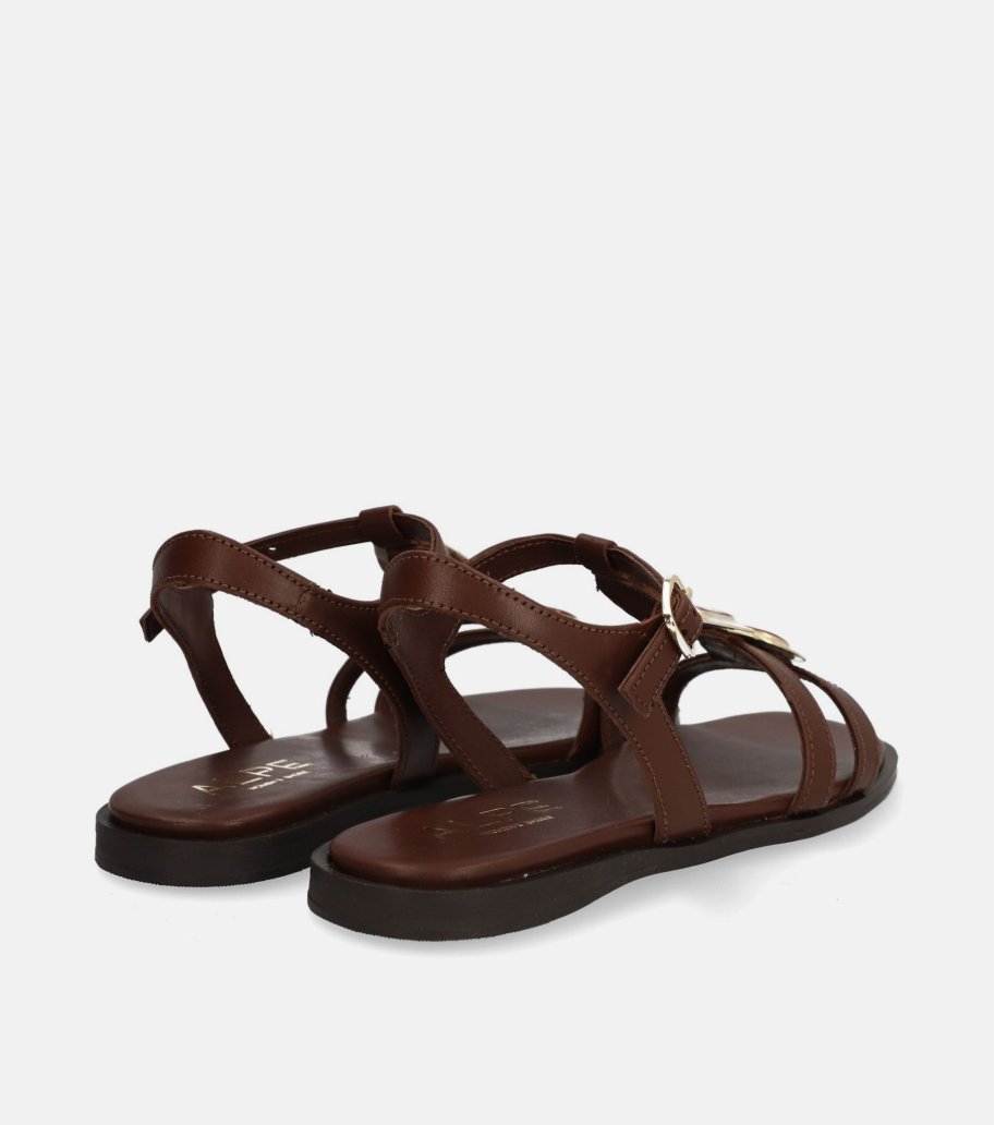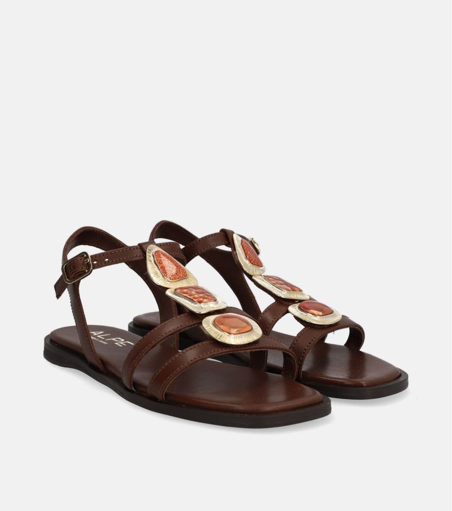 Sandalia de Alpe en color cuero. Confeccionada en piel de becerro. Diseño elegante con apliques metálicos en dorado que aportan un toque distintivo. Cierre de hebilla al tobillo que proporciona sujeción y estabilidad. Cómoda suela plana.
