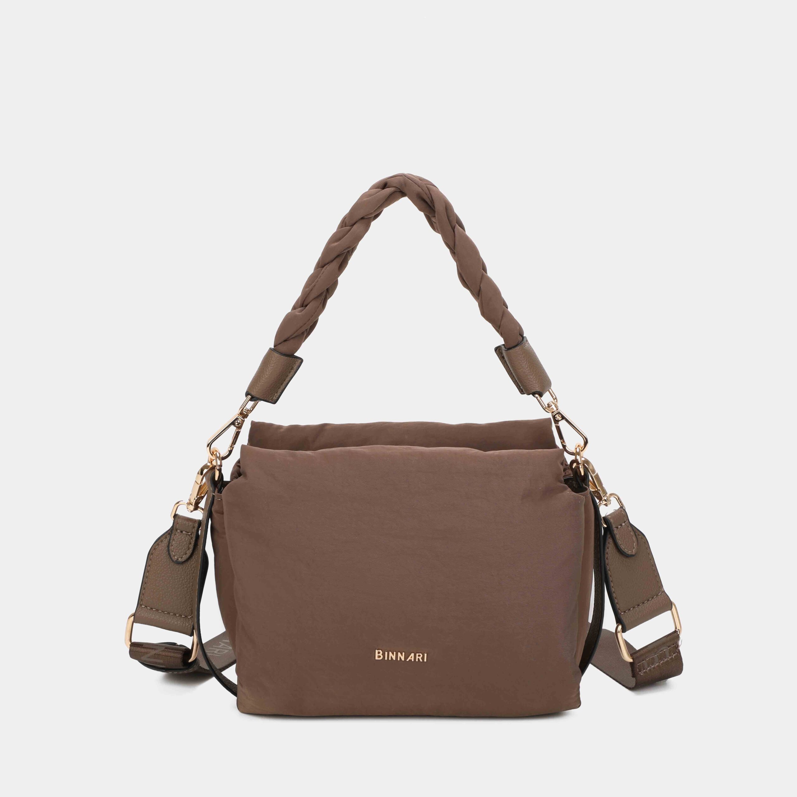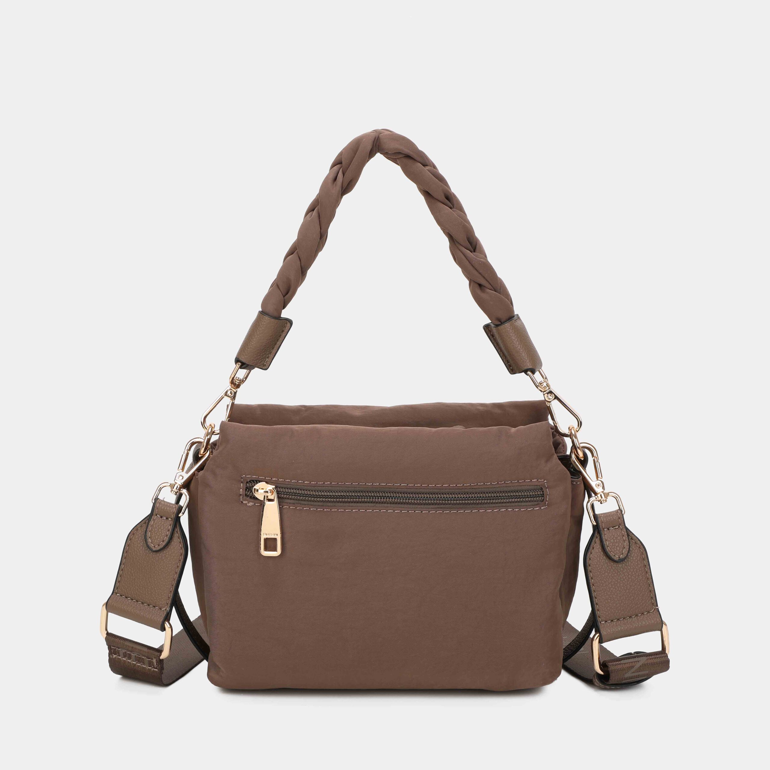 Bolso bandolera Carla confeccionada en nylon y detalles en pu de alta calidad .Se accede a su interior por medio de una cremallera principal superior y en él encontramos varios bolsillos, uno de ellos con cremallera para aportar así una seguridad mayor. Tiene 2 posiciones: bandolera y de hombro gracias al asa trenzada. Los detalles metálicos son de color oro claro.