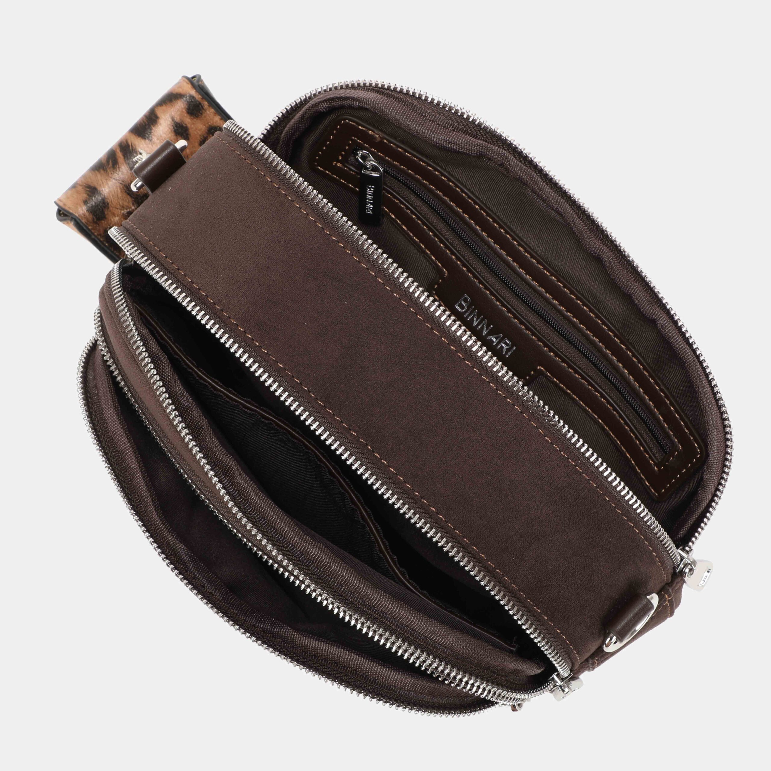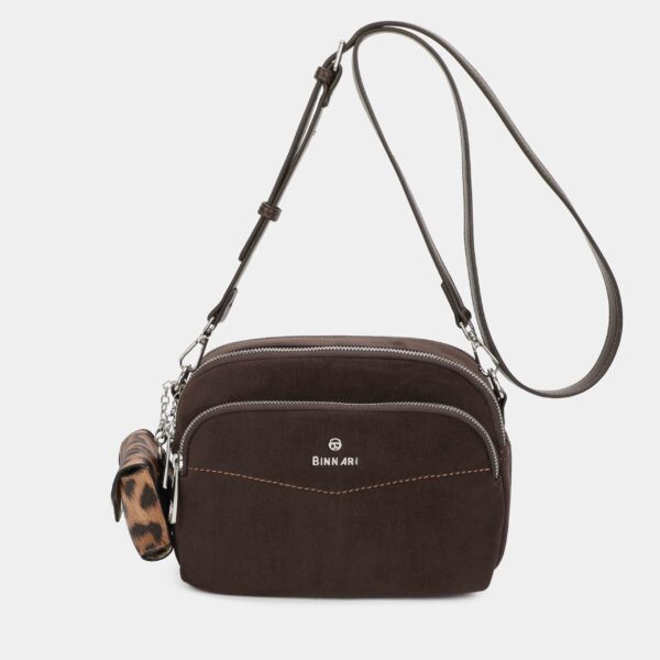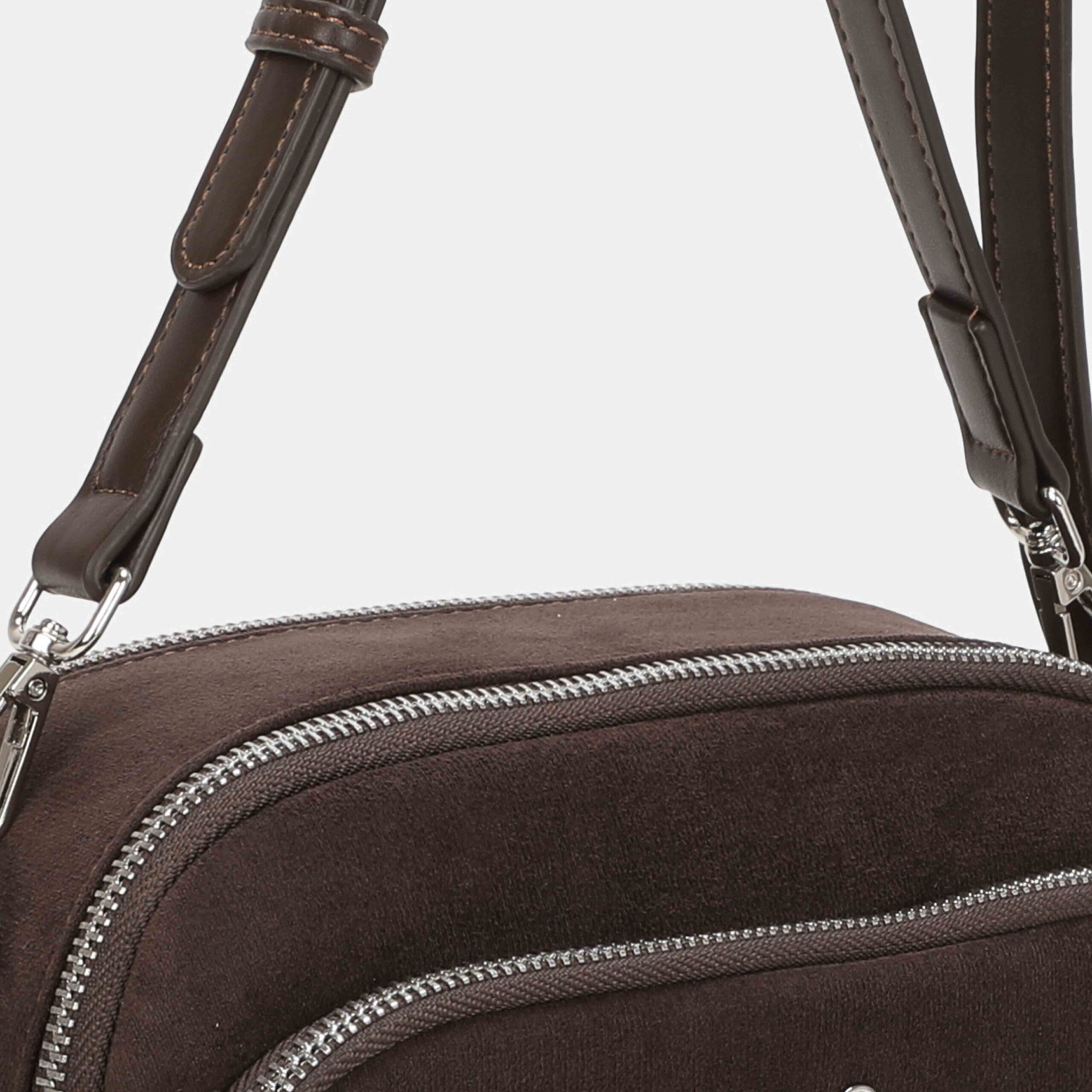 Bolso bandolera Glen disponible en marrón.Confeccionada en pu y antelina, es una bandolera de tamaño pequeño pero capaz de guardar todo lo imprescindible. En la parte frontal, tiene un bolso pequeño extraible. Su asa es ajustable. Detalles metálicos en color nickel.