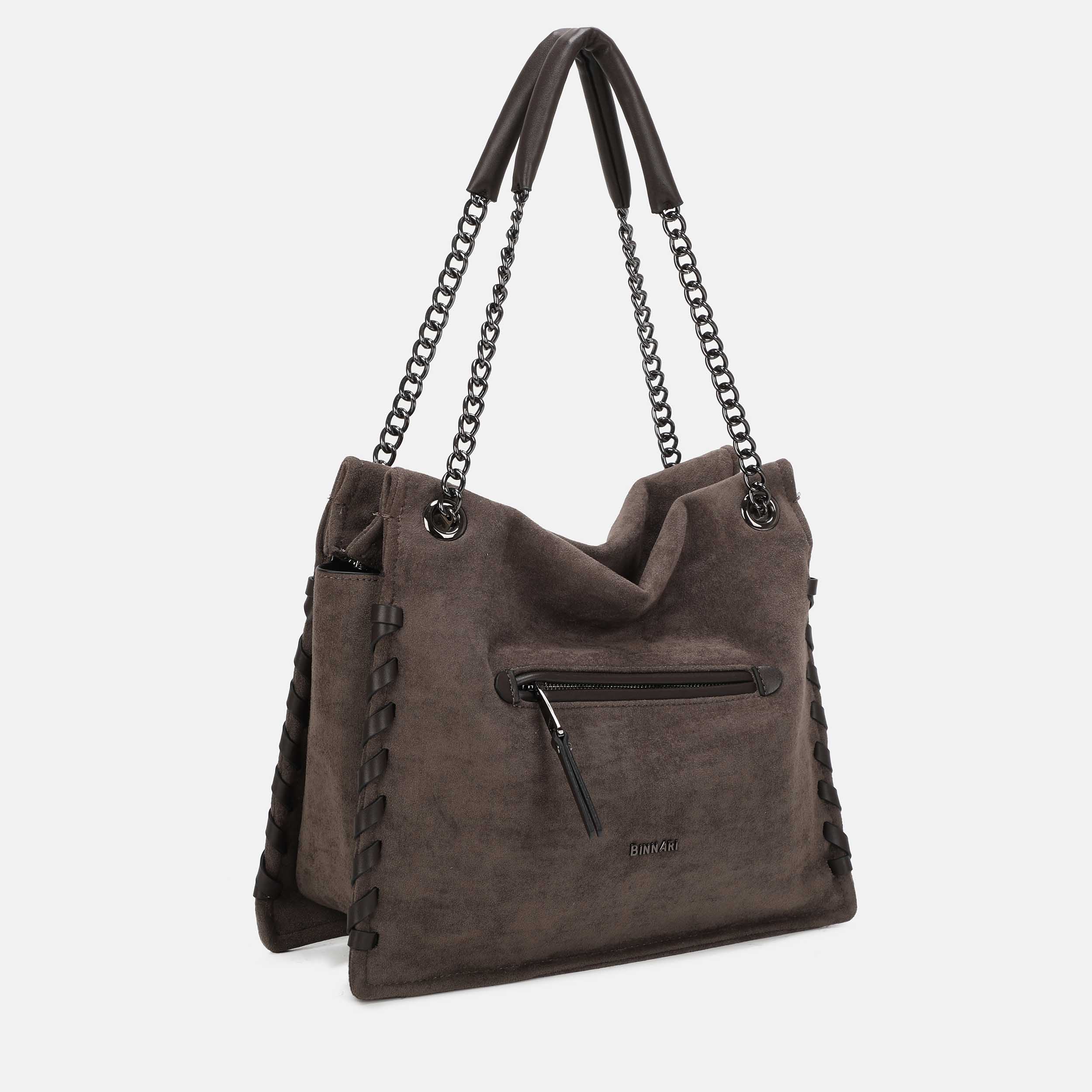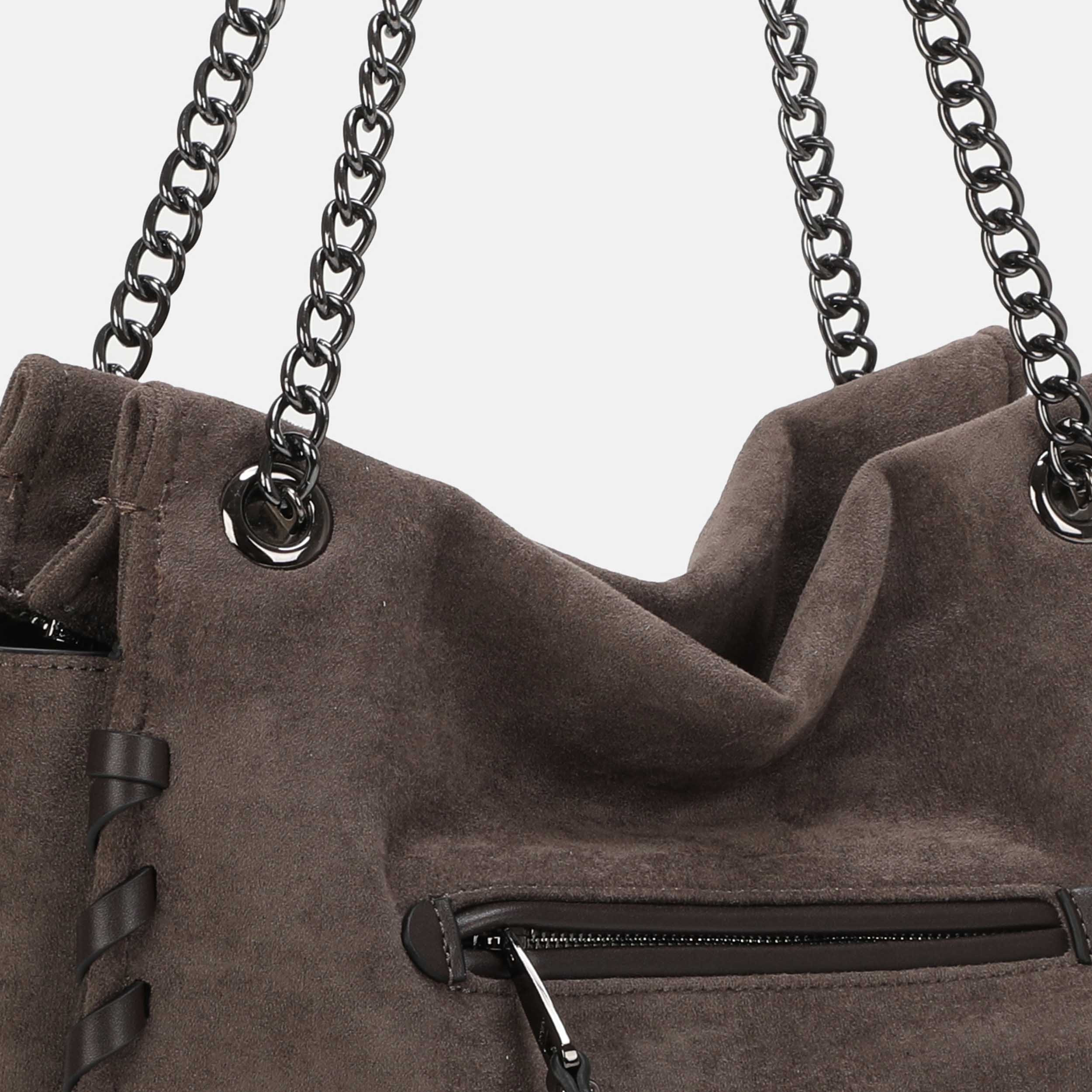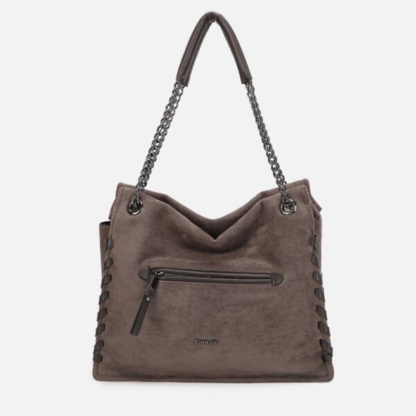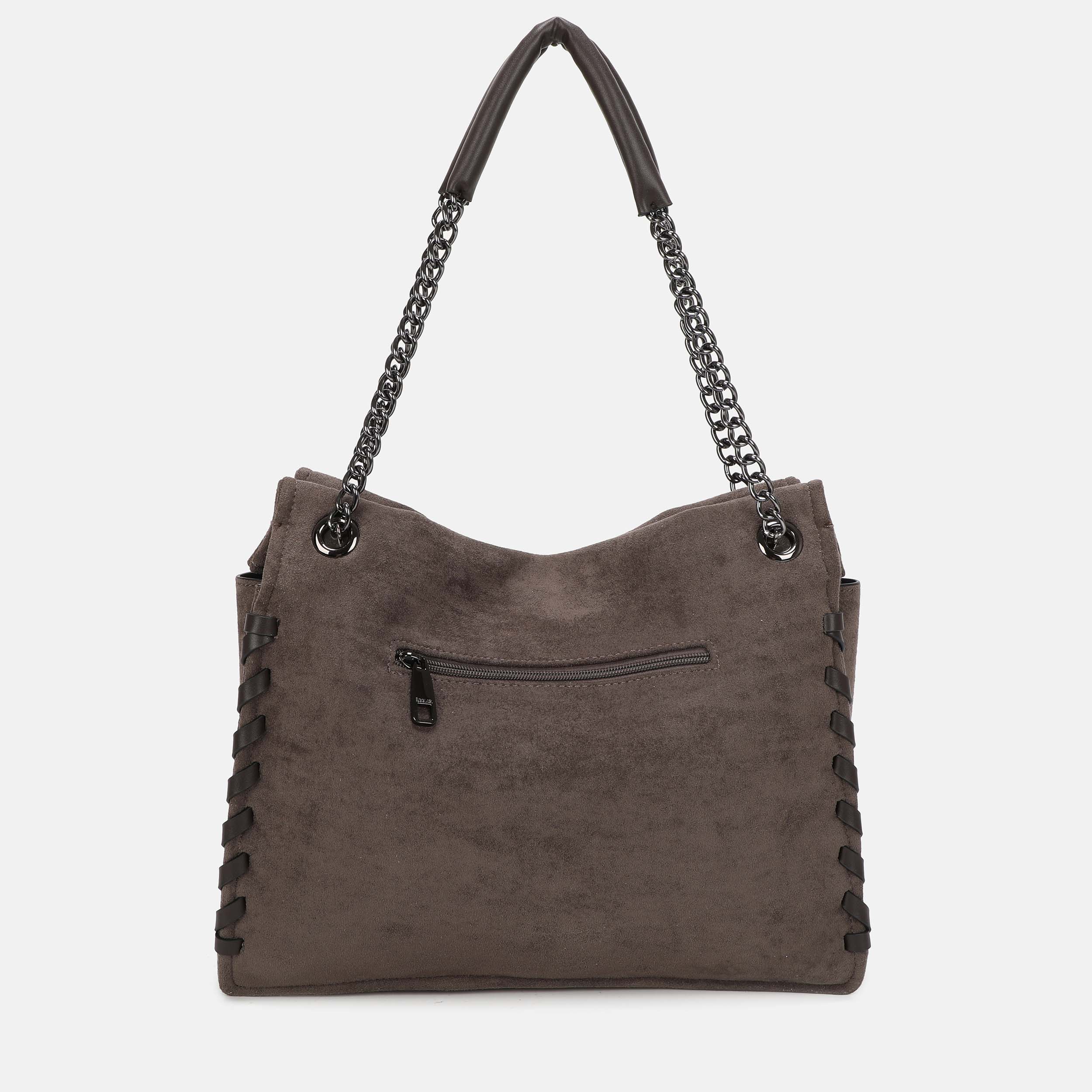 Bolso dos asas Flavia disponible en 2 colores. Está confeccioando en antelina y detalles en pu de alta calidad. Asa trenzada combinada con eslabones metálicos. Bolsillo con cremallera en la parte frontald el bolsos. Los detalles son de color nickel. ¿qué te parece?