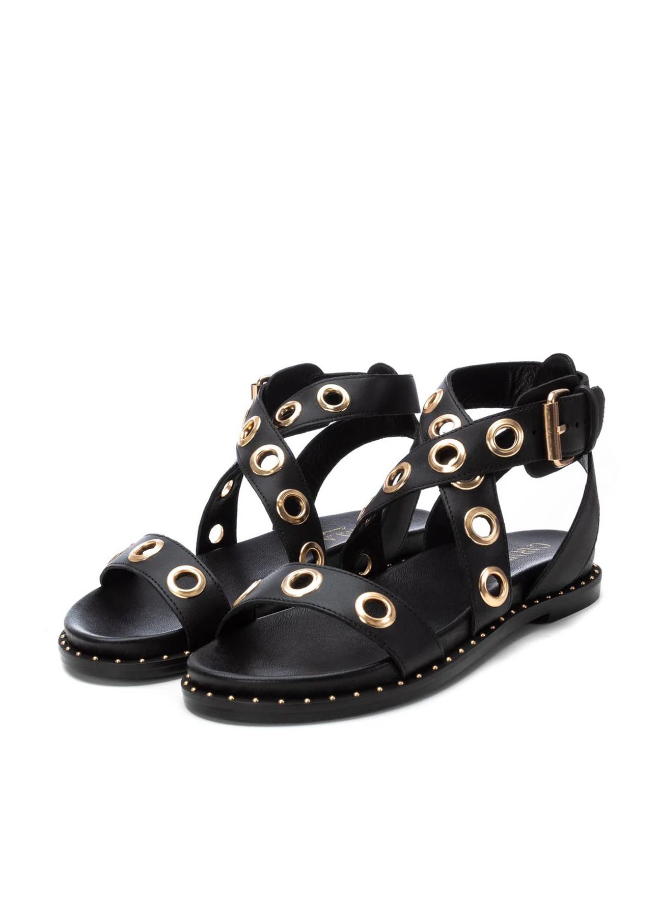 Sandalia de mujer, marca Carmela. Fabricada en piel de alta calidad. Modelo estilo romana con anillas metálicas decorativas para crear un mayor estilo y elegancia. Cómoda planta y suela antideslizante.